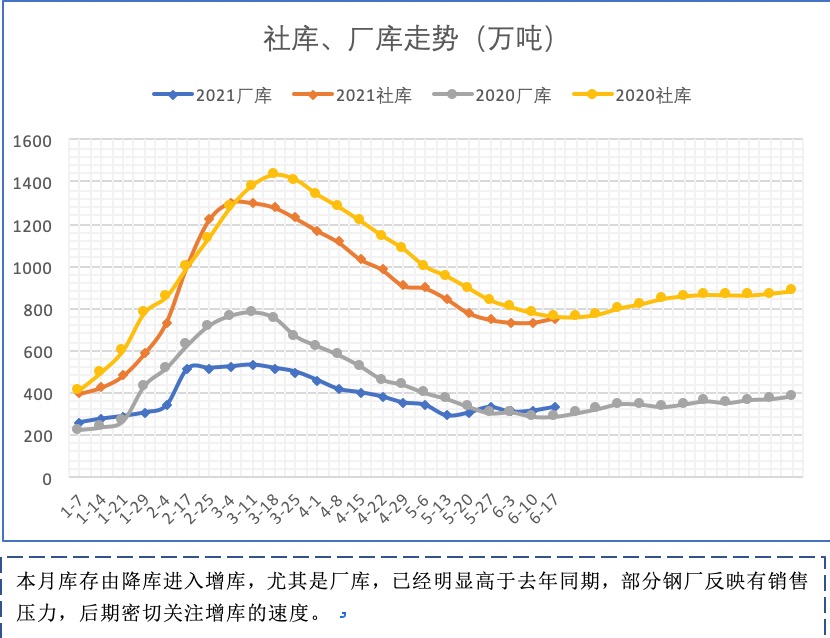 本月,行业基本面从旺季需求下的库存持续去化转变为梅雨高温的传统淡季,库存拐点初步显现,后期应关注库存增速快慢。大的宏观背景是全球货币宽松见顶,经济复苏带来的实际需求的大幅增长尚不明显,导致大宗商品普遍回调,宏观推动的大宗商品普涨有暂告段落的迹象。明者因时而变 知者随事而制,虽然钢材的供需格局还没有大的变化,但是资金面、政策面已经出现明显的信号,对行情的判断也需要根据这些信号做出调整。7月份是传统淡季,宏观面也没有更多的利好消息,预计价格将偏弱运行。