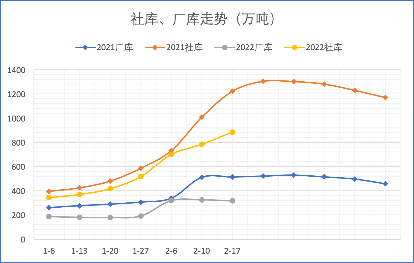 春节后第三周,库存量远低于去年同期,低于去年同期超过600万吨,厂库第三周开始降库,单从库存来看,静态的供给远低于去年同期。