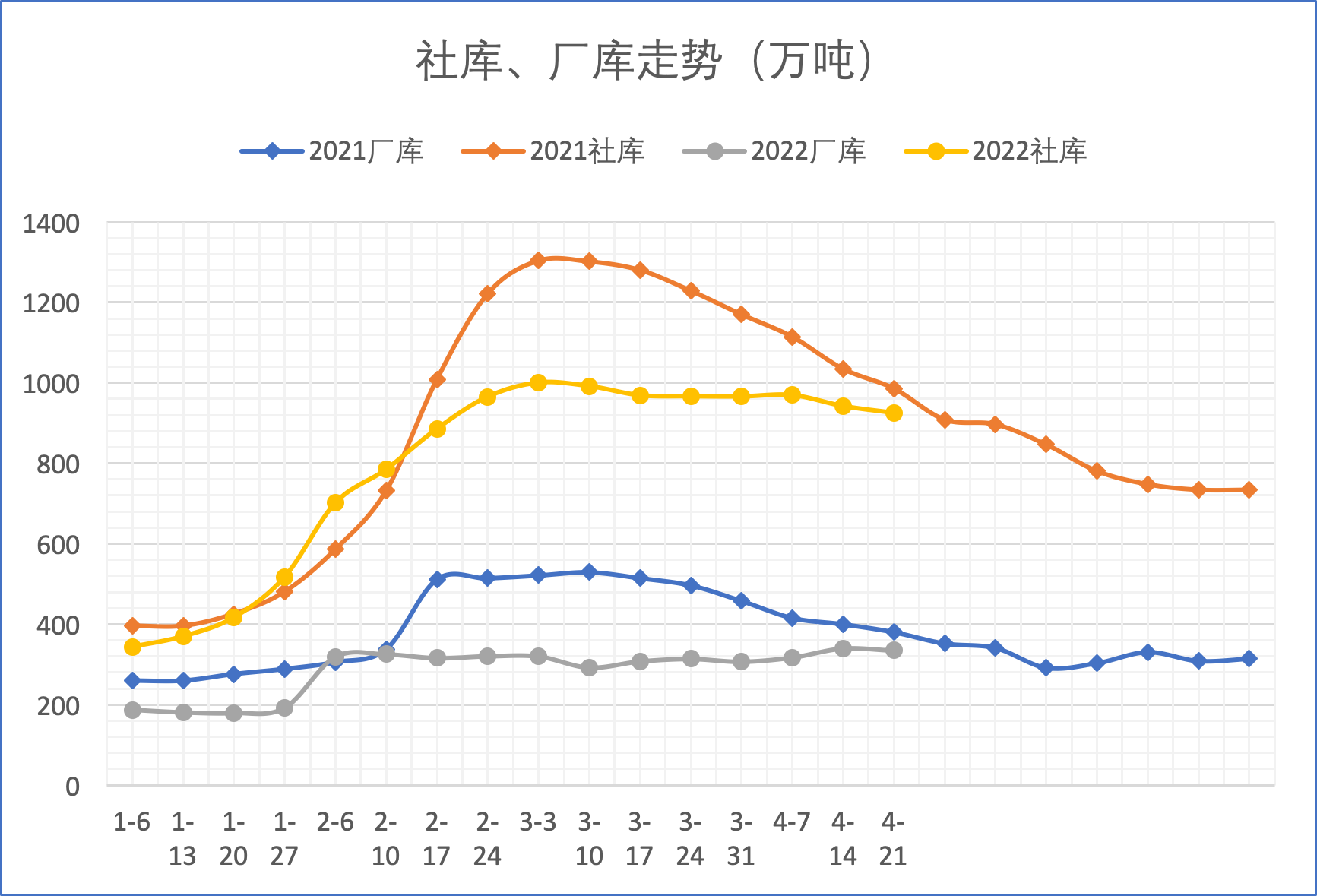 受疫情影响,今年的库存降库明显不及预期,去年同期降库速度在每周50-60万吨左右,今年库存一直得不到有效的去化,总体库存水平已经接近去年同期。