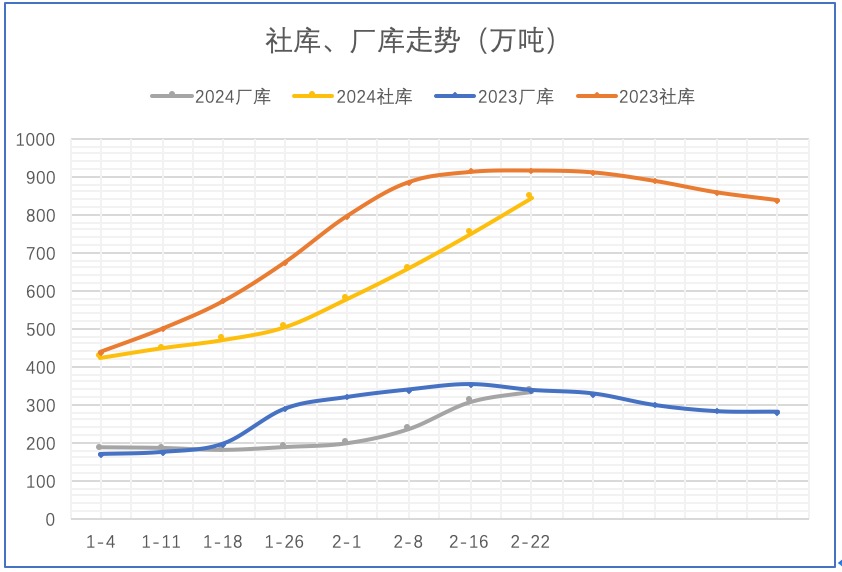 春节期间,库存开始快速累库,节后第一周,库存1180.04万吨,农历同比去年1113万吨,库存高于去年同期。